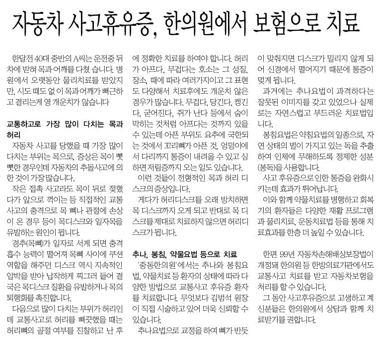 자동차 사고 휴유증,한의원에서 보험으로 치료 > 미디어&칼럼
