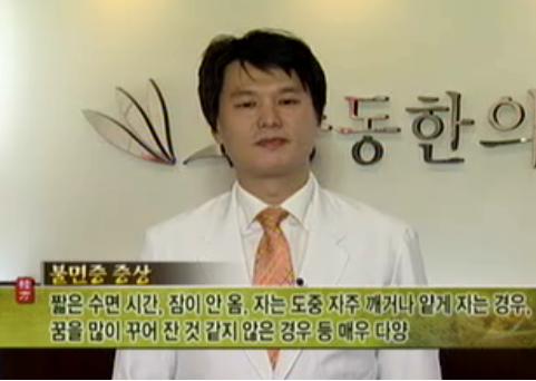 긴 밤을 잠 못 이루고 뒤척이다가 결국엔 새벽이 되어서야 잠이 들고, 그러다 보면 하루종일 피곤에 부쳐 일도 손에 안잡히게 됩니다. 그래서 불면증의 고통은 당하지 않은 사람은 알 수 없을 만큼 감당하기 힘듭니다.이유 없이 불면증을 겪고 있다고 생각해도 모든 병에는 이유가 있는 것처럼 분명 자신의 불면증 상태에는 그에 해당하는 원인이 있습니다. 이 방송을 보고계시는 시청자 여러분들도, 지금 불면증으로 고생하고 계신다면 가까운 한의원에 내원하셔서 현재 본인의 몸상태와 병의 원인을 파악하고, 이를 토대로 적극적으로 치료를 해보시기 바랍니다.