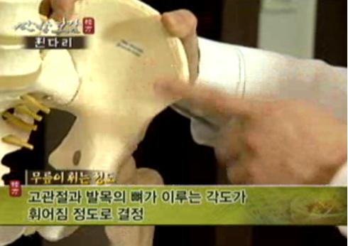 우선 휜다리를 보면, 무릎이 휘어있는 것이 눈에 쉽게 띄실 텐데요. 무릎이 휘는 것은 무릎 자체가 휘는 것보다는 고관절과 발목의 뼈가 이루는 각도가 어떻게 휘어있는가가 무릎을 휜 정도를 결정하는 것입니다. 그러므로 고관절과 골반과의 각도와 발목과 종아리뼈의 각도가 휜다리에서 중요한 것이지요. 무릎은 고관절과 발목의 중간으로 고관절과 발목관절의 각도 차이가 무릎이 휘는 정도를 결정하는 것입니다.