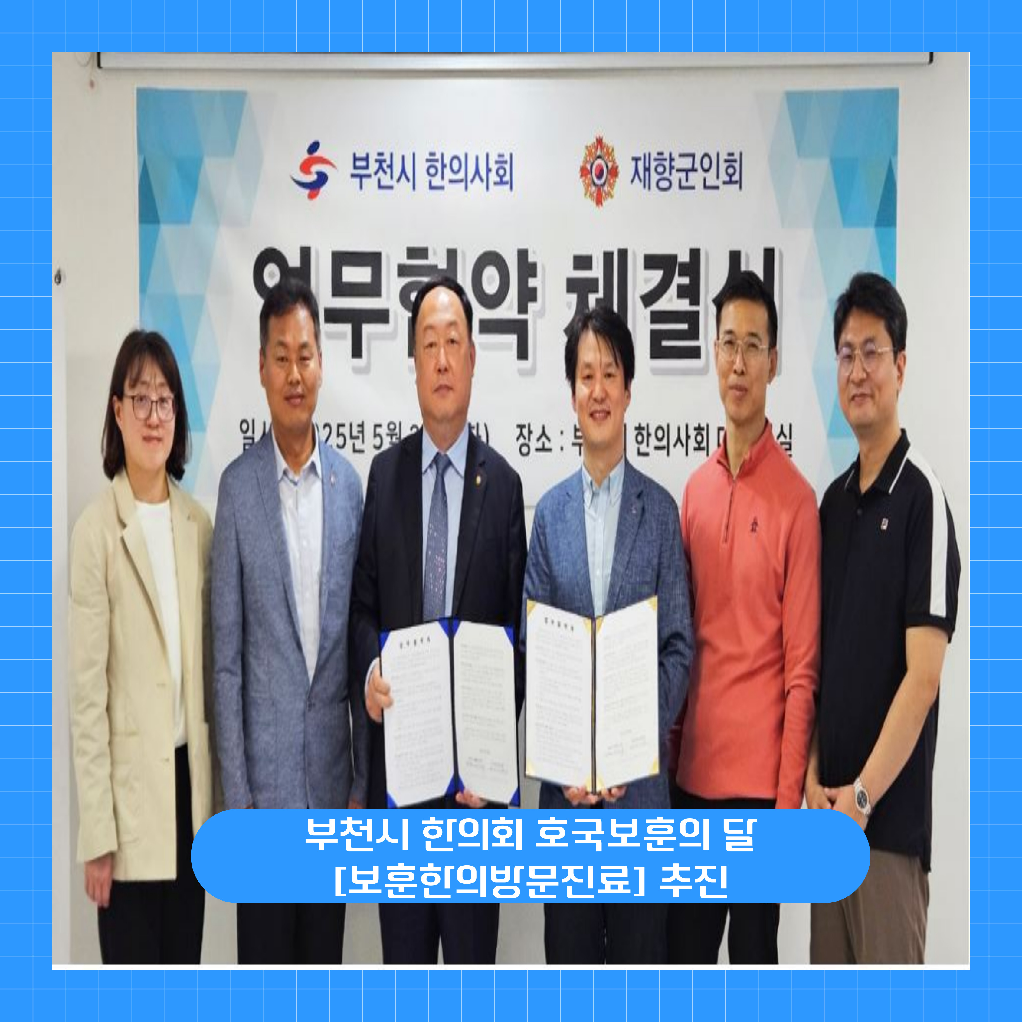 [한의신문] 부천시한의사회(회장 김범석·이하 부천시분회)는 부천시재향군인회(회장 김영민)와 20일 분회회관에서 업무협약을 체결, 재향군인 및 가족을 대상으로 한의약 건강 돌봄사업에 나서기로 했다.