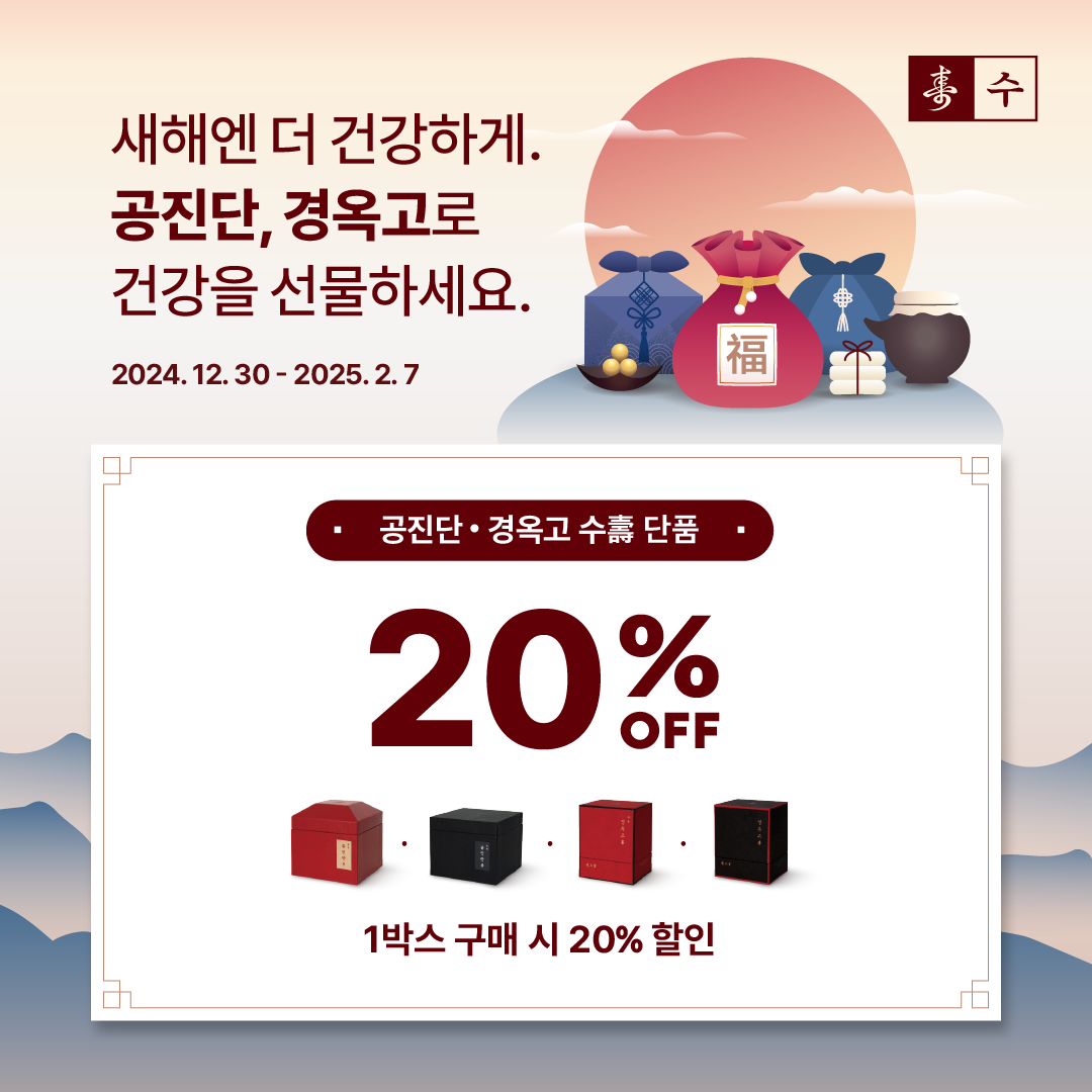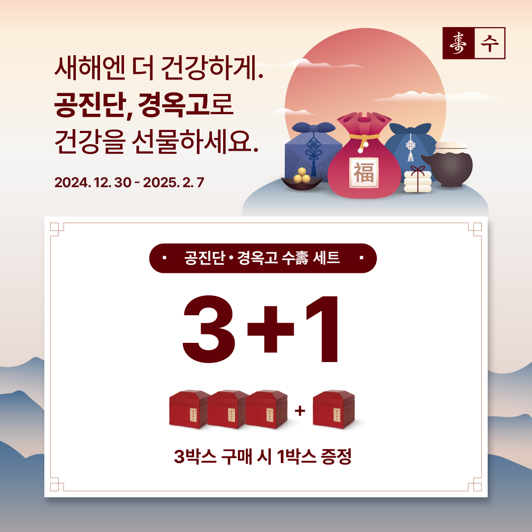 새해에는 건강과 활력을 선물하세요!★ 이벤트 내용 ★경옥고: 온 가족이 함께 건강해질 수 있는 보약!공진단: 활력과 면역을 위한 최고의 선물!→ 특별 할인 가격 제공★이벤트 기간★ 2024년 12월 30일 ~ 2025년 2월 7일새해를 맞아 사랑하는 가족과 지인에게 건강한 마음을 전하세요!♥ 함께 나누는 건강, 따뜻한 마음이 더욱 빛나는 새해가 될 거예요. ♥ 인쇄 주소