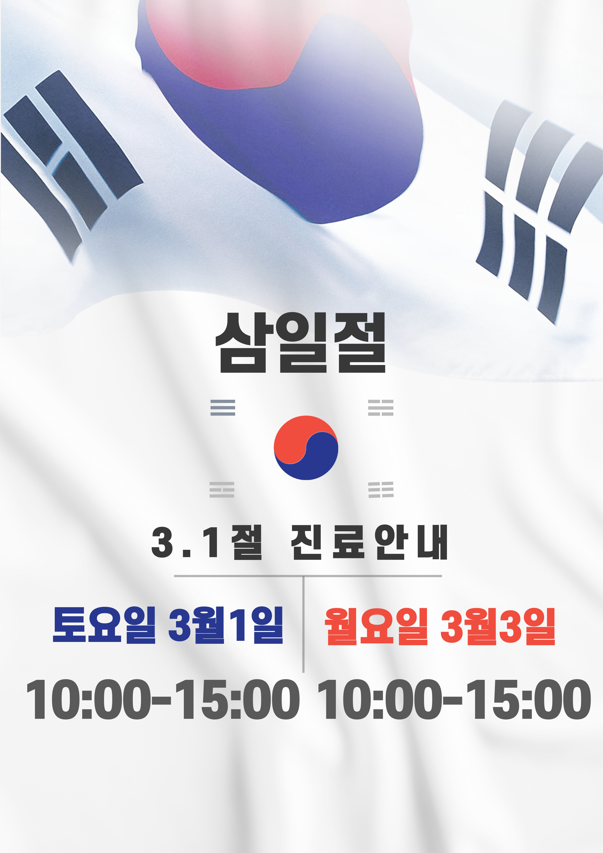 삼일절 진료안내드립니다~3월 1일 삼일절(토요일) 10시~3시3월 3일 대체공휴일(월요일) 10시~3시 ★접수마감은 치료마감 30분전입니다★건강하고 행복한 일만 가득하세요 ♥<진료시간>※ 월~ 목요일 : 오전 10시~오후 8시 (야간)※ 금요일 : 오전 10시~오후 7시※ 토요일, 공휴일 : 오전 10시~오후 3시※일요일 : 휴진★ 매일 점심시간 없이 진료합니다. ★ 인쇄 주소
