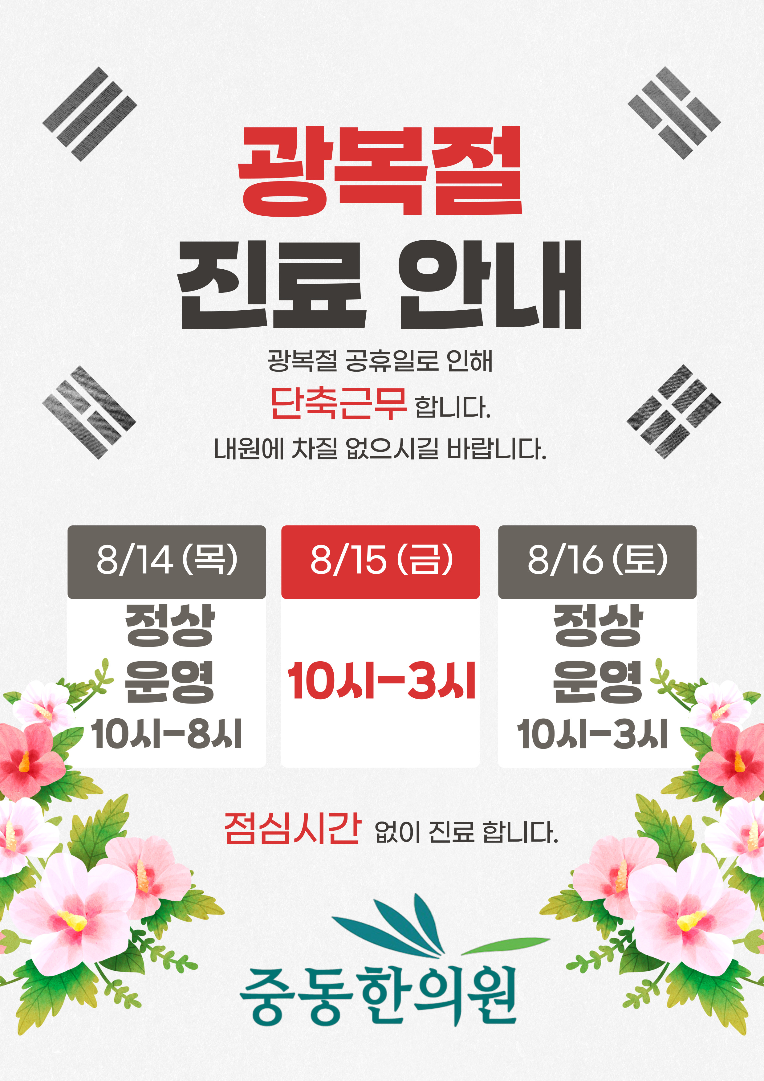 중동한의원 8월 15일 공휴일 진료안내드립니다.