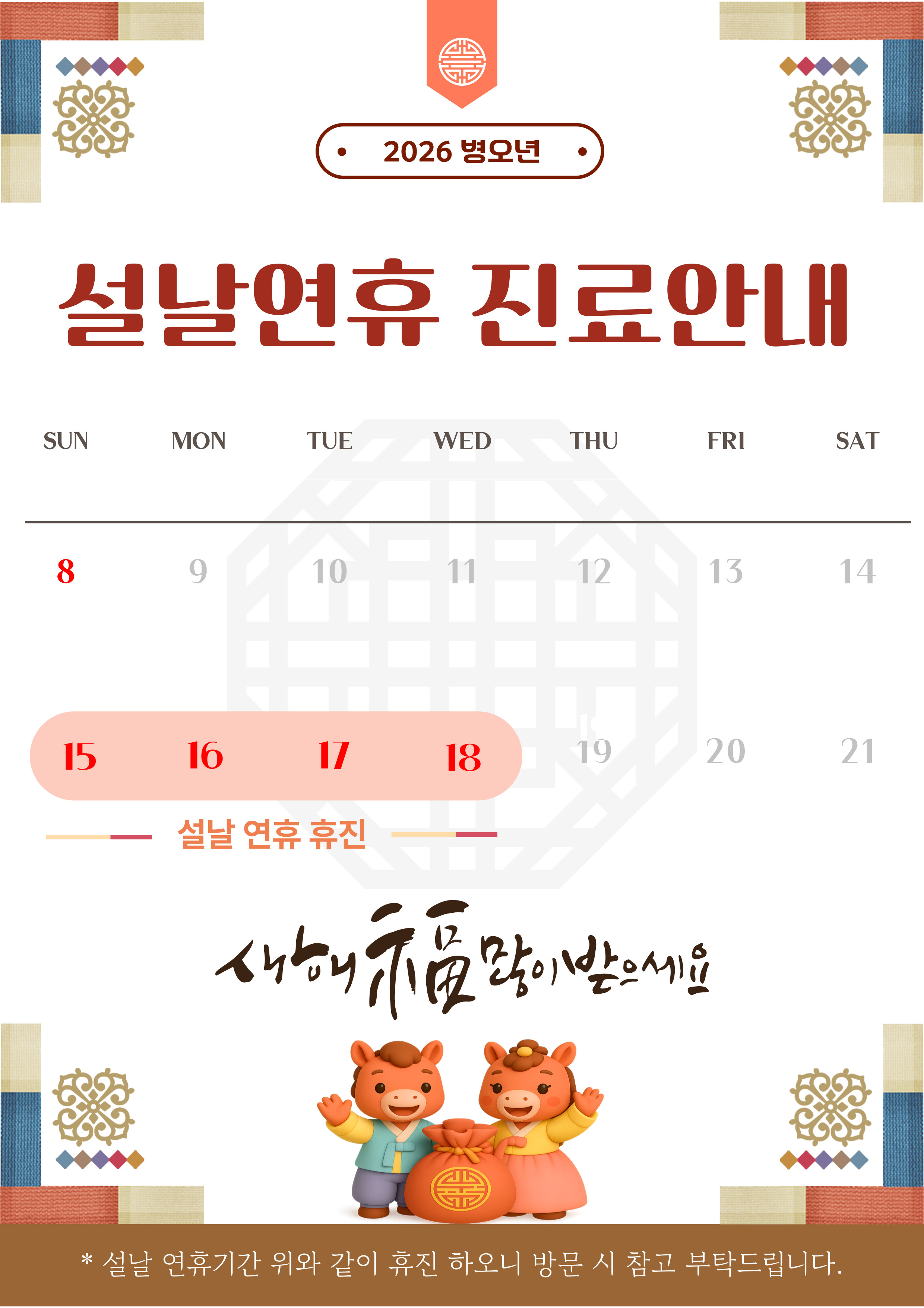 안녕하세요~중동한의원입니다^^. 설연휴 진료 안내드립니다. -2월 15일(일요일) 휴진-2월 16~17일(설날연휴) 휴진-2월 19일(목요일) 정상진료 ★진료 등록 마감은 마지막 진료시간 30분 전입니다.★ 인쇄 주소